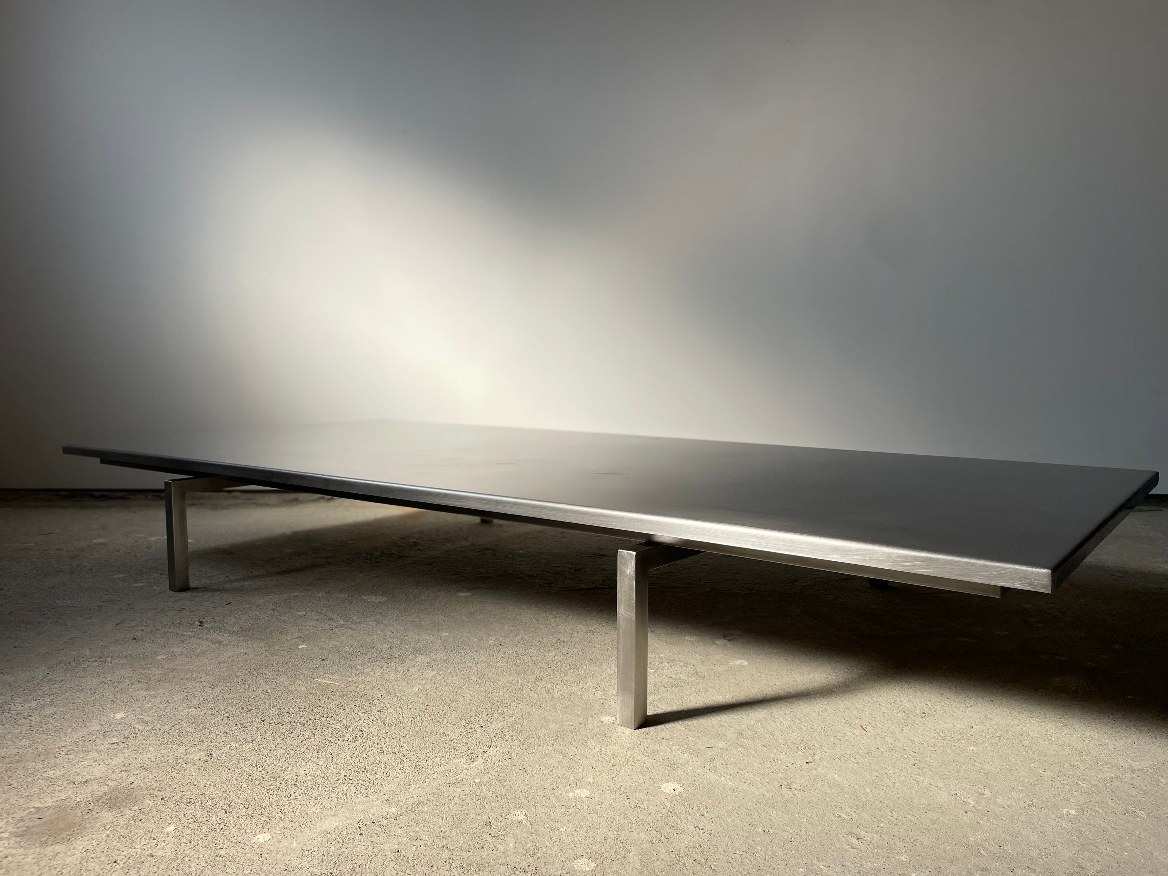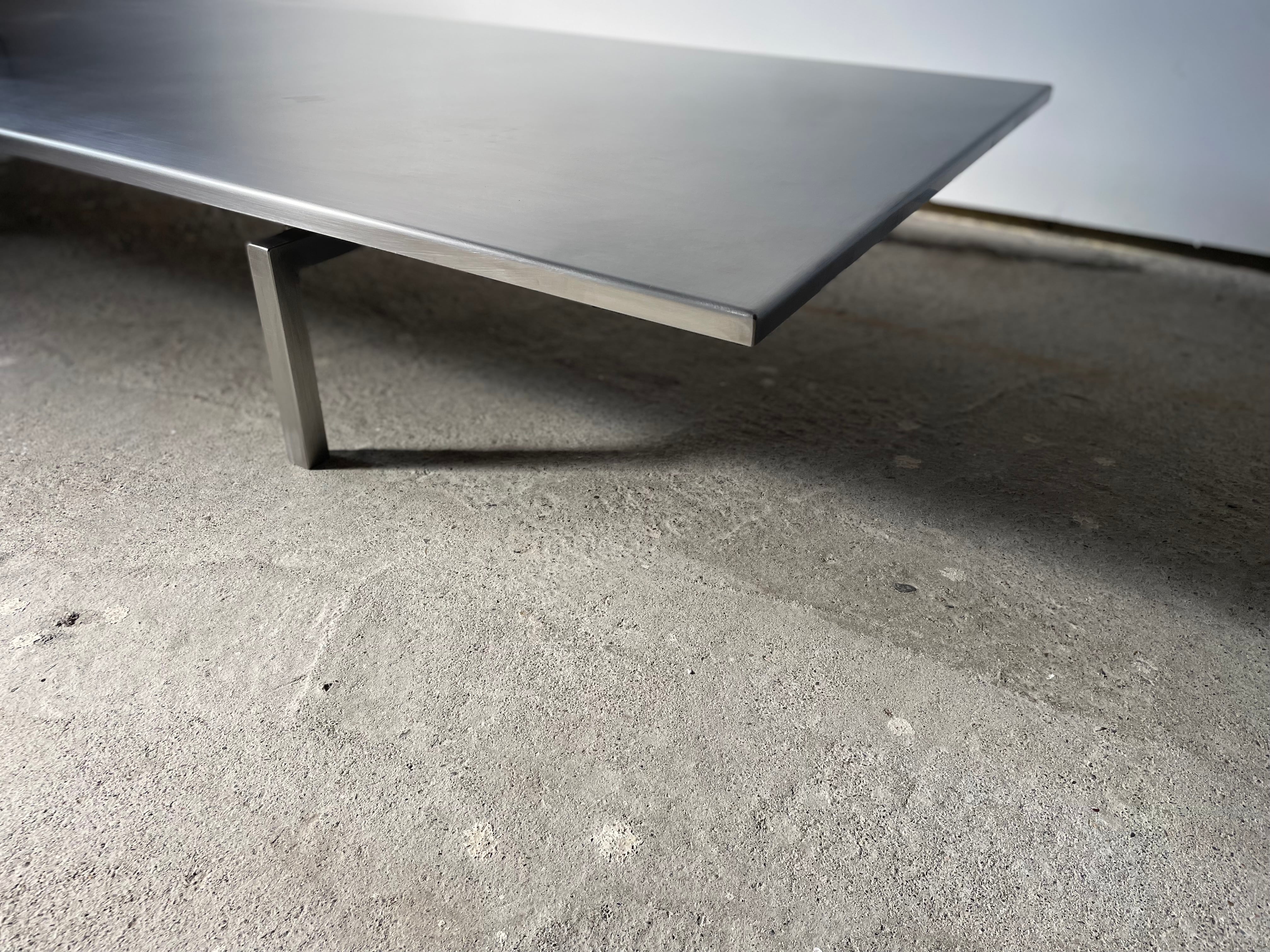 脚と天板に隙間を作り浮遊感を出し、天板は公共物のようなヘアラインでは無く意匠的に温かみと手触り感を持たせた仕上げ。