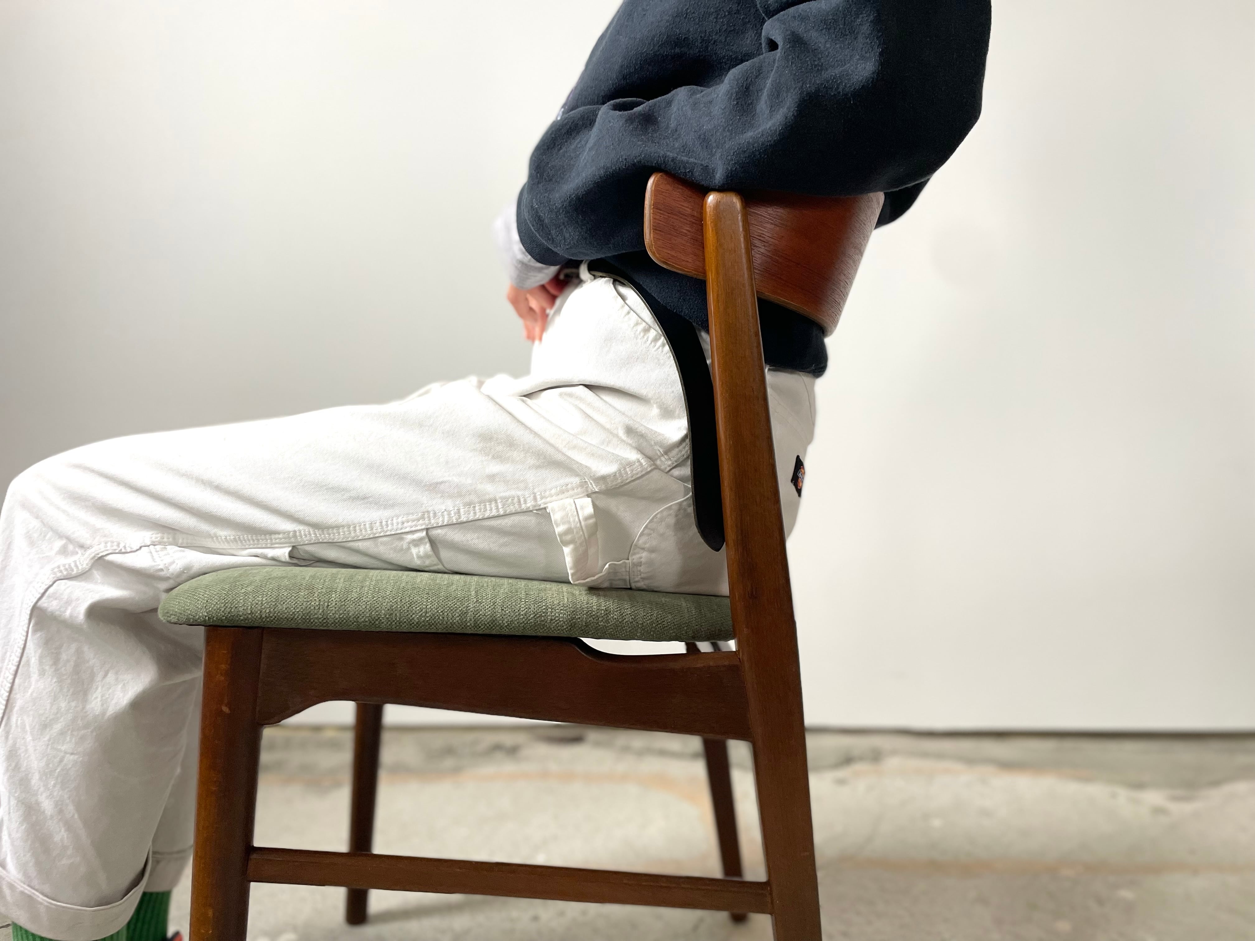 U字に曲げられた背もたれは非常にホールド感があり、肘を乗せてハーフアームの様な座り方も可能、それにより通常のダイニングチェアに比べて安楽性もやや高め。